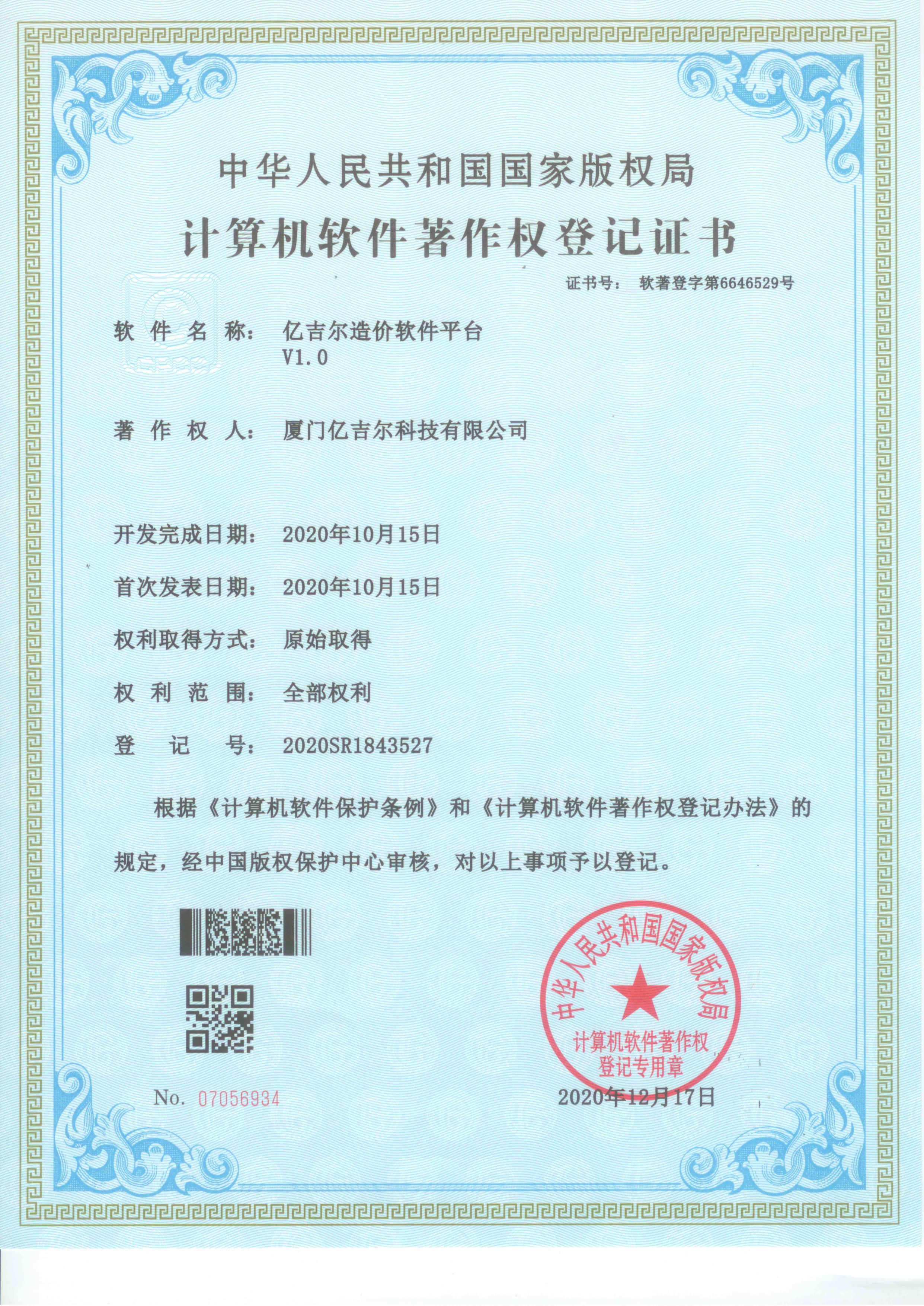 億吉爾造價(jià)軟件平臺(tái)著作權(quán)登記證書(shū) 發(fā)布日期:2023年11月22日 瀏覽次數(shù):2116 關(guān)鍵字: 公司 1/1億吉爾造價(jià)軟件平臺(tái)著作權(quán)登記證書(shū)