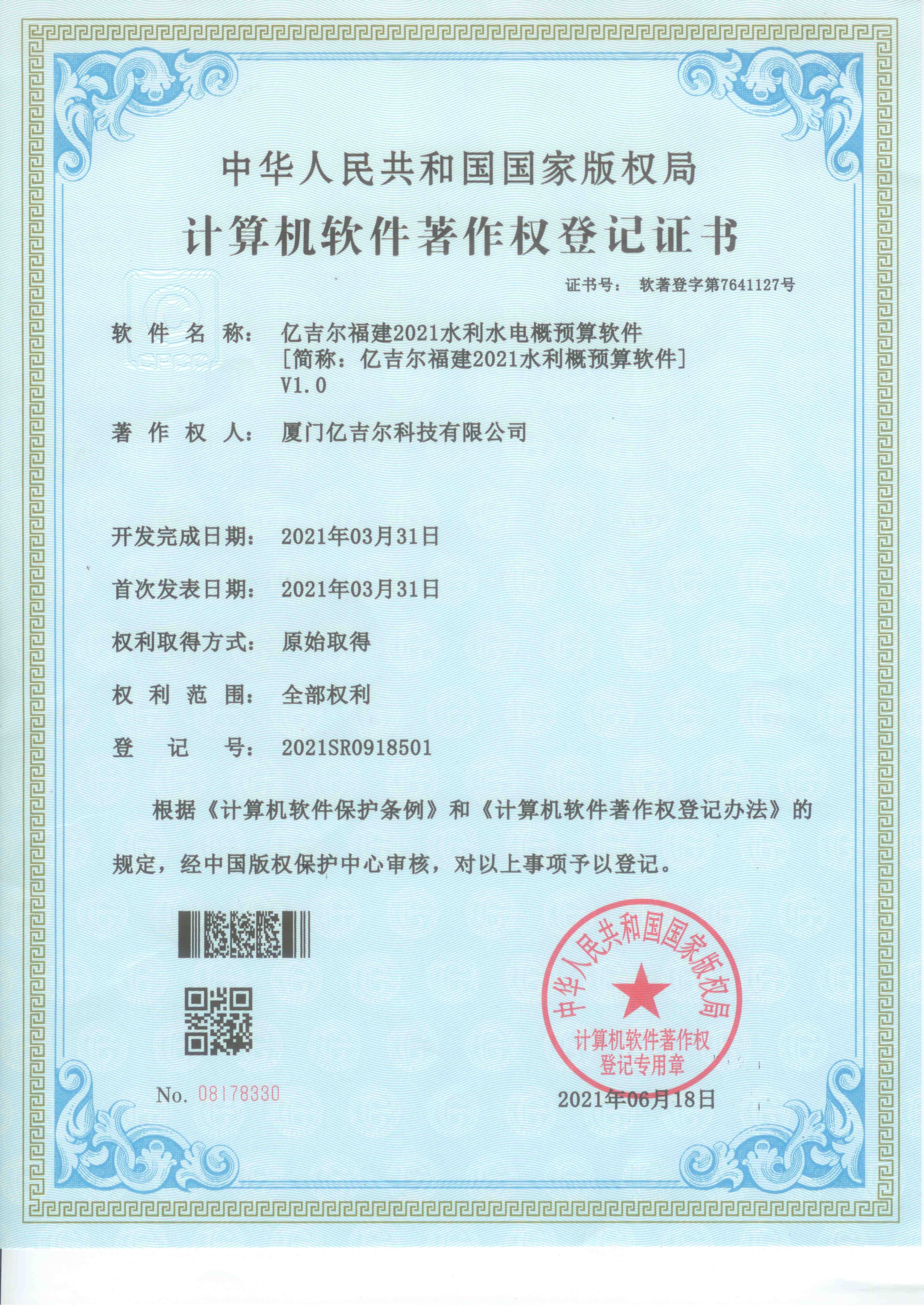4. 億吉爾福建2021水利水電概預(yù)算軟件著作權(quán)證書