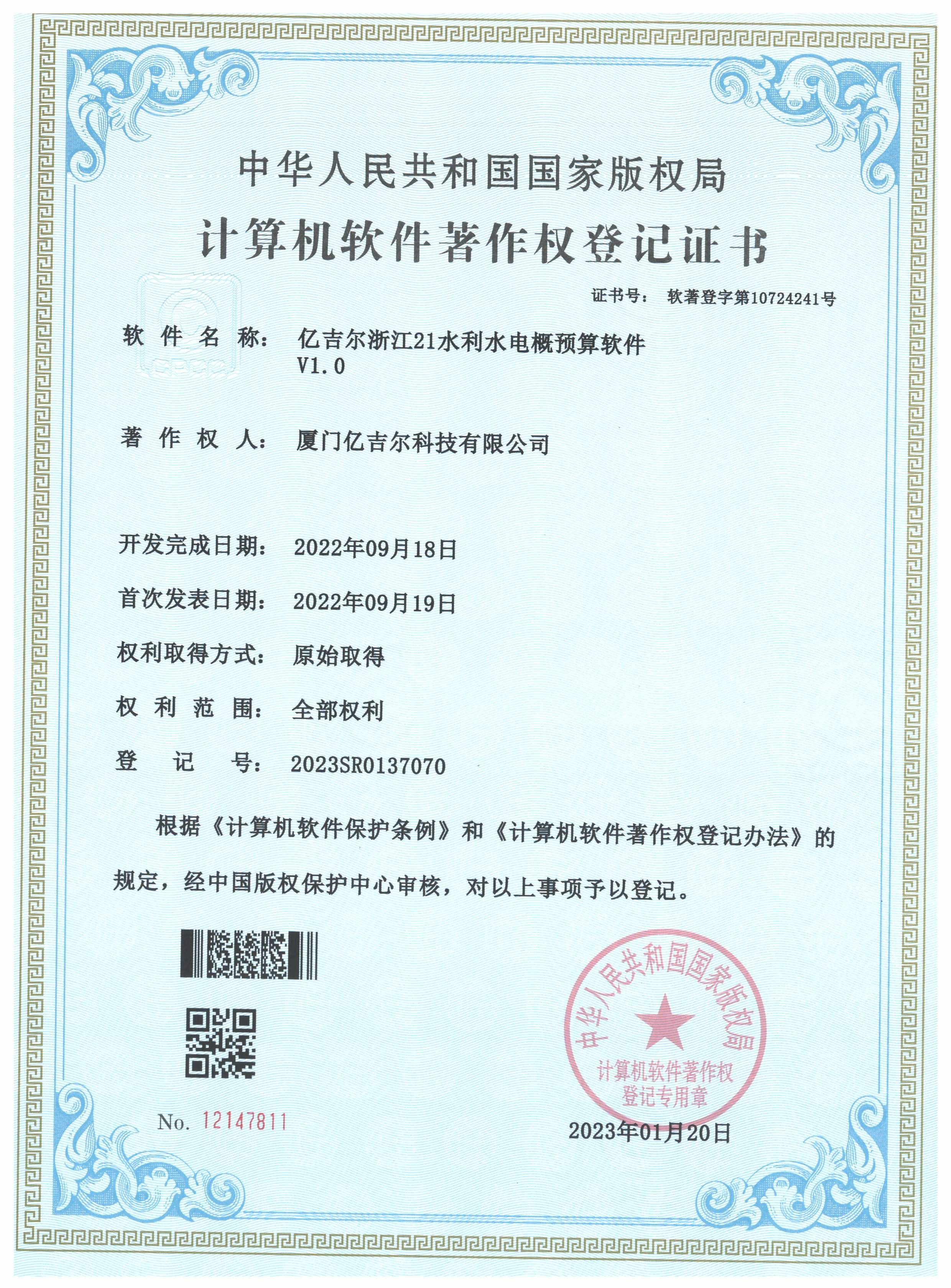 億吉爾浙江21水利水電概算軟件登記證書 發(fā)布日期:2023年11月22日 瀏覽次數(shù):2121 關(guān)鍵字: 公司 1/1億吉爾浙江21水利水電概算軟件登記證書(2022R11L1869444)