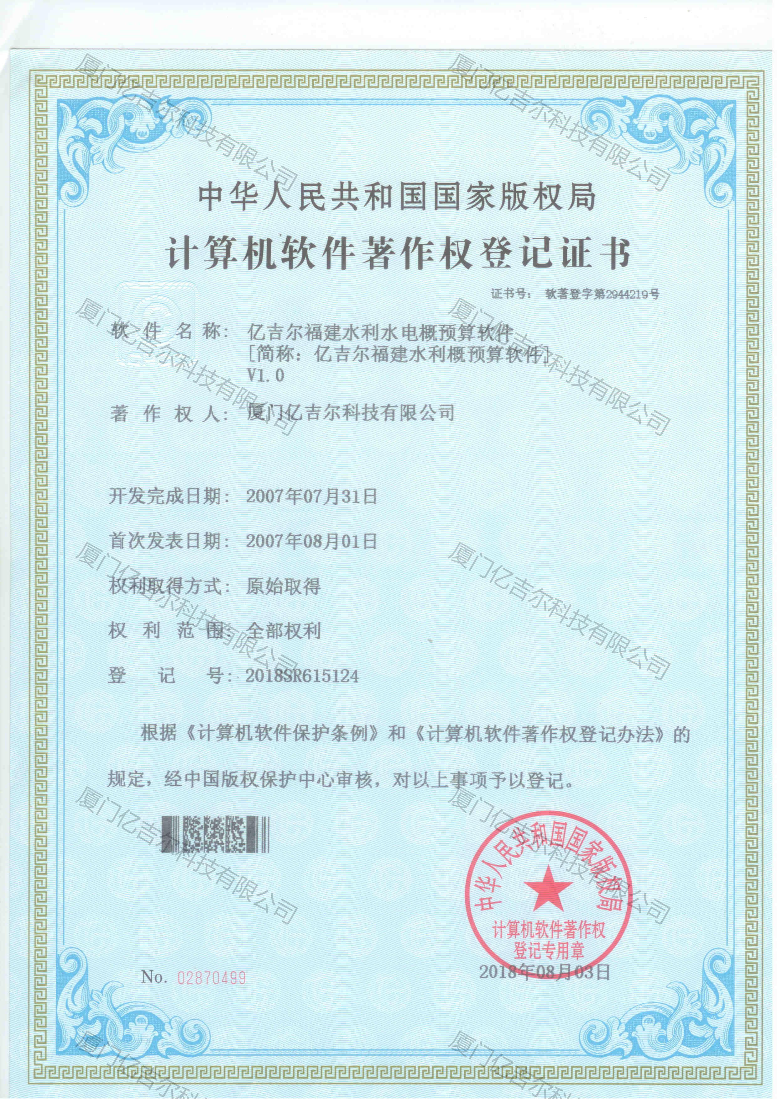 億吉爾福建水利水電概預算軟件著作權(quán)登記證書 發(fā)布日期:2018年08月03日 瀏覽次數(shù):3686 關(guān)鍵字: 公司 1/1億吉爾福建水利水電概預算軟件著作權(quán)登記證書