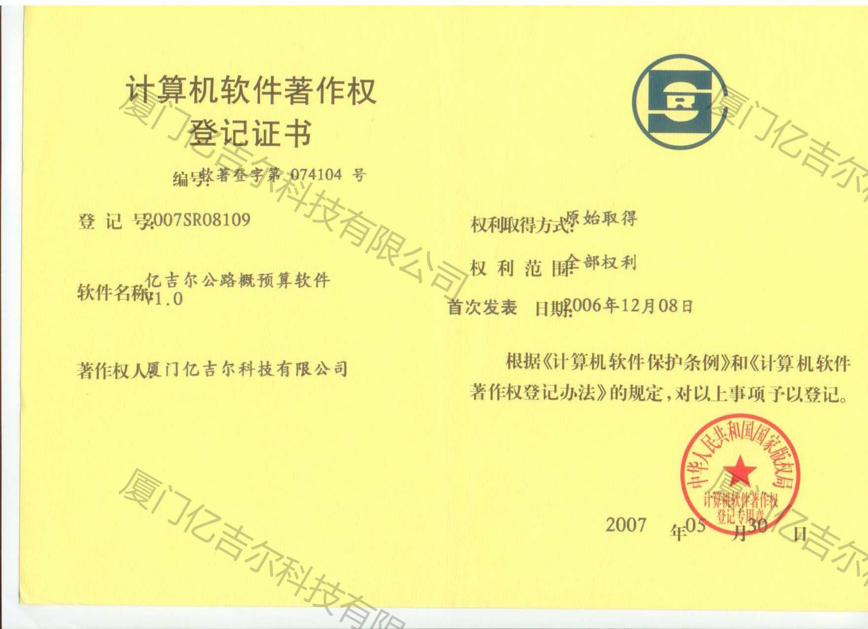 億吉爾公路概預(yù)算軟件著作權(quán)登記證書