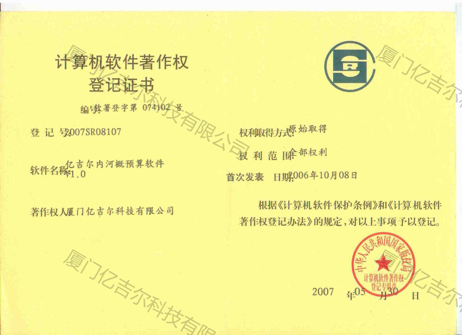 億吉爾內(nèi)河概預(yù)算軟件著作權(quán)登記證書 發(fā)布日期:2007年05月30日 瀏覽次數(shù):3526 關(guān)鍵字: 公司 1/1億吉爾內(nèi)河概預(yù)算軟件著作權(quán)登記證書