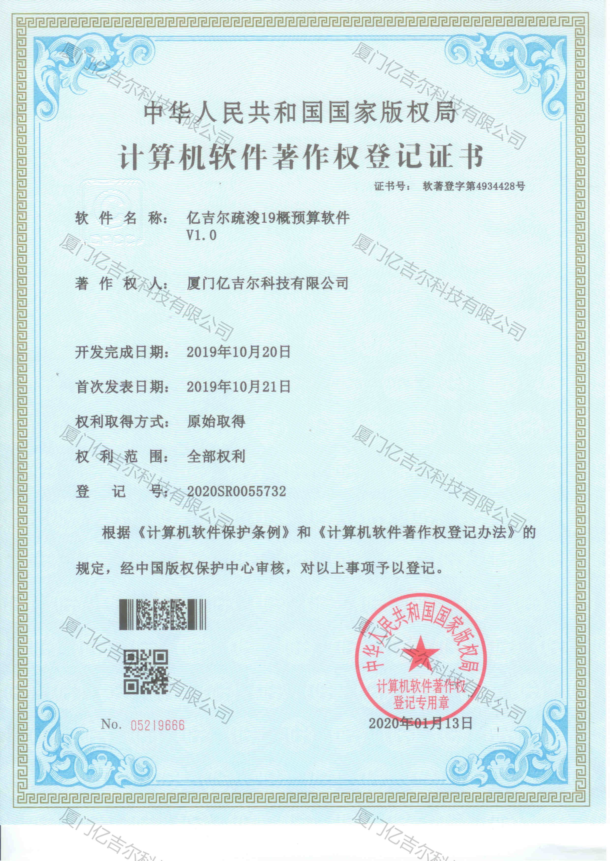 億吉爾疏浚19概預(yù)算軟件著作權(quán)登記證書