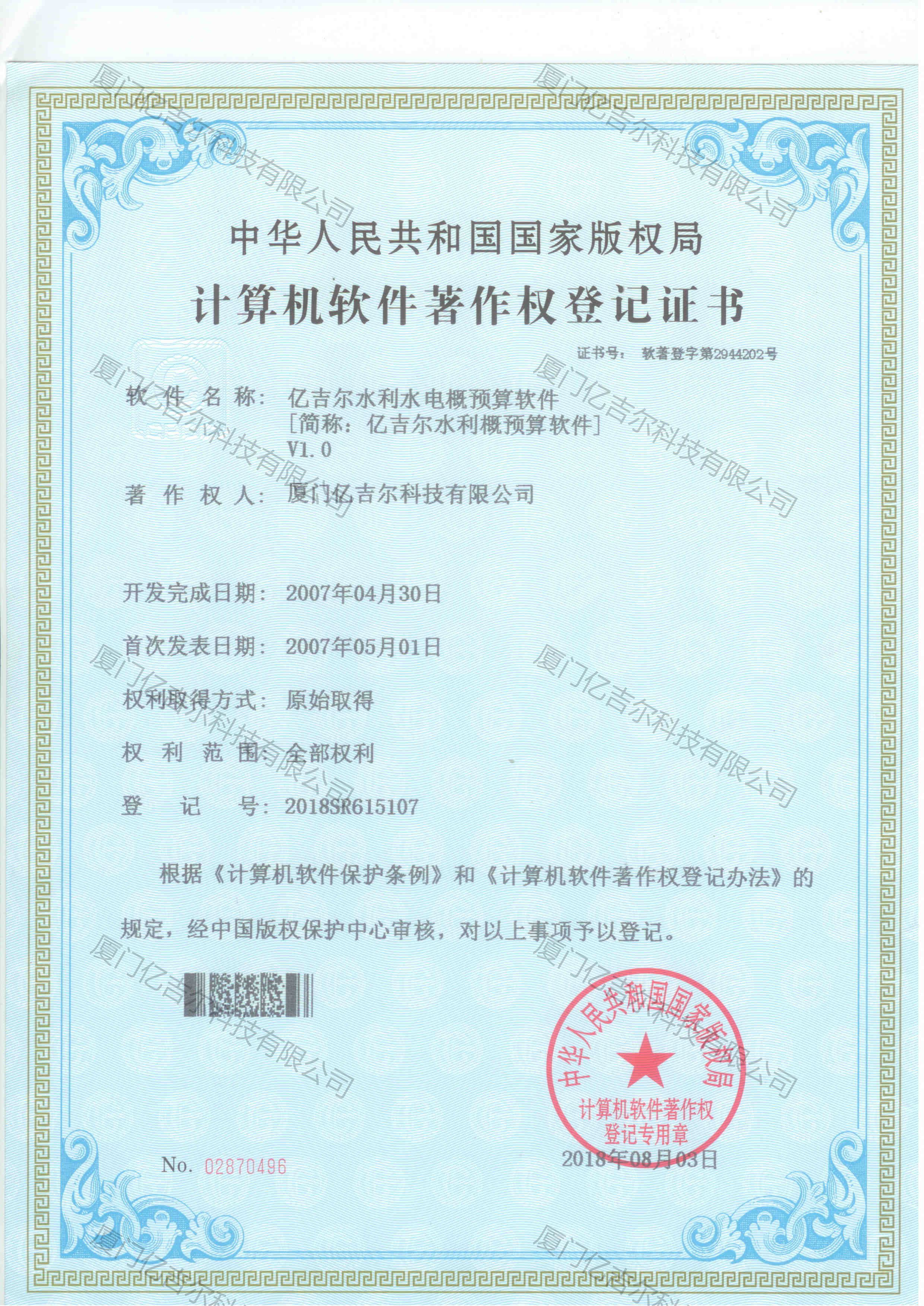 億吉爾水利水電概預算軟件著作權登記證書