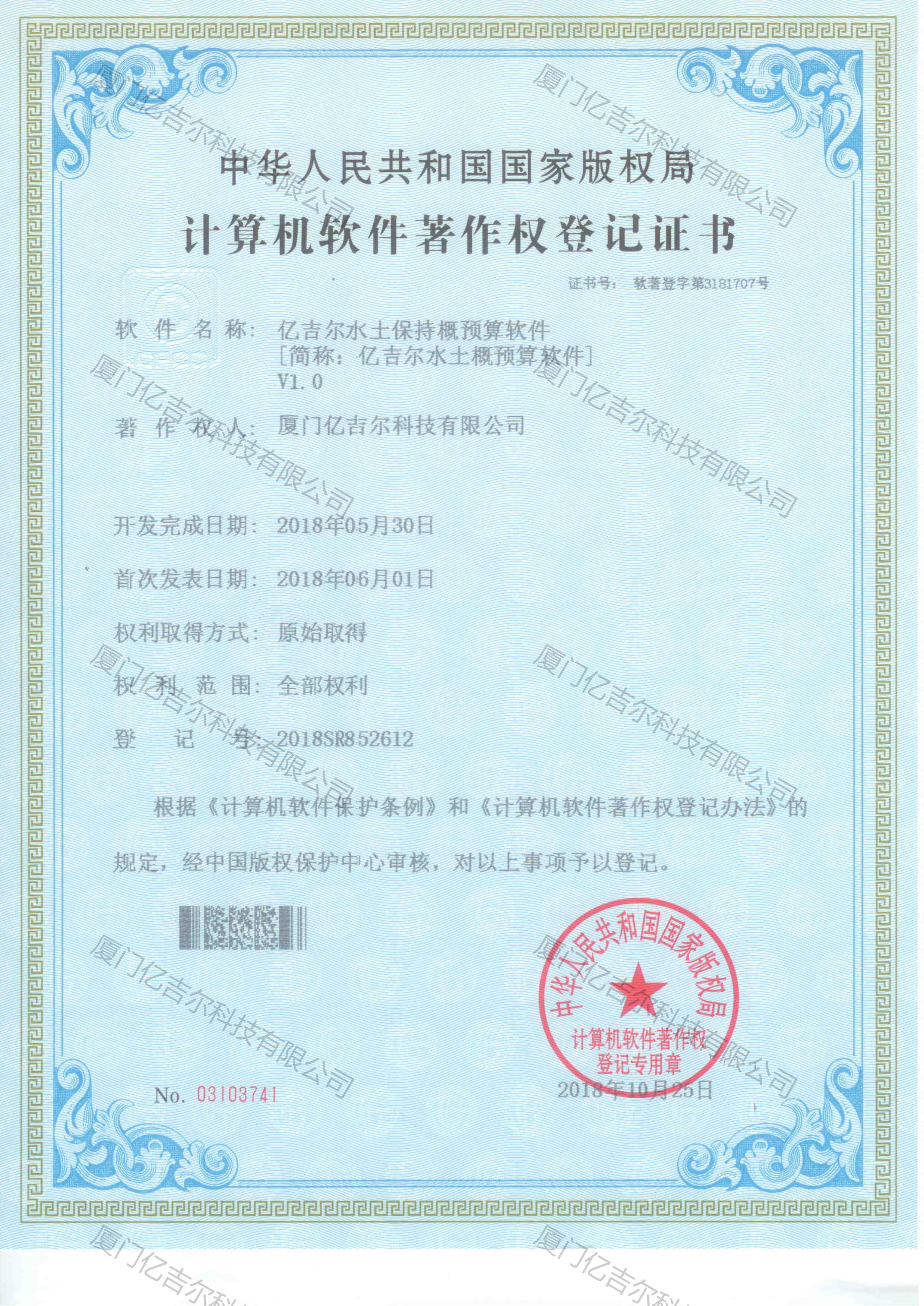 億吉爾水土保持概預(yù)算軟件著作權(quán)登記證書