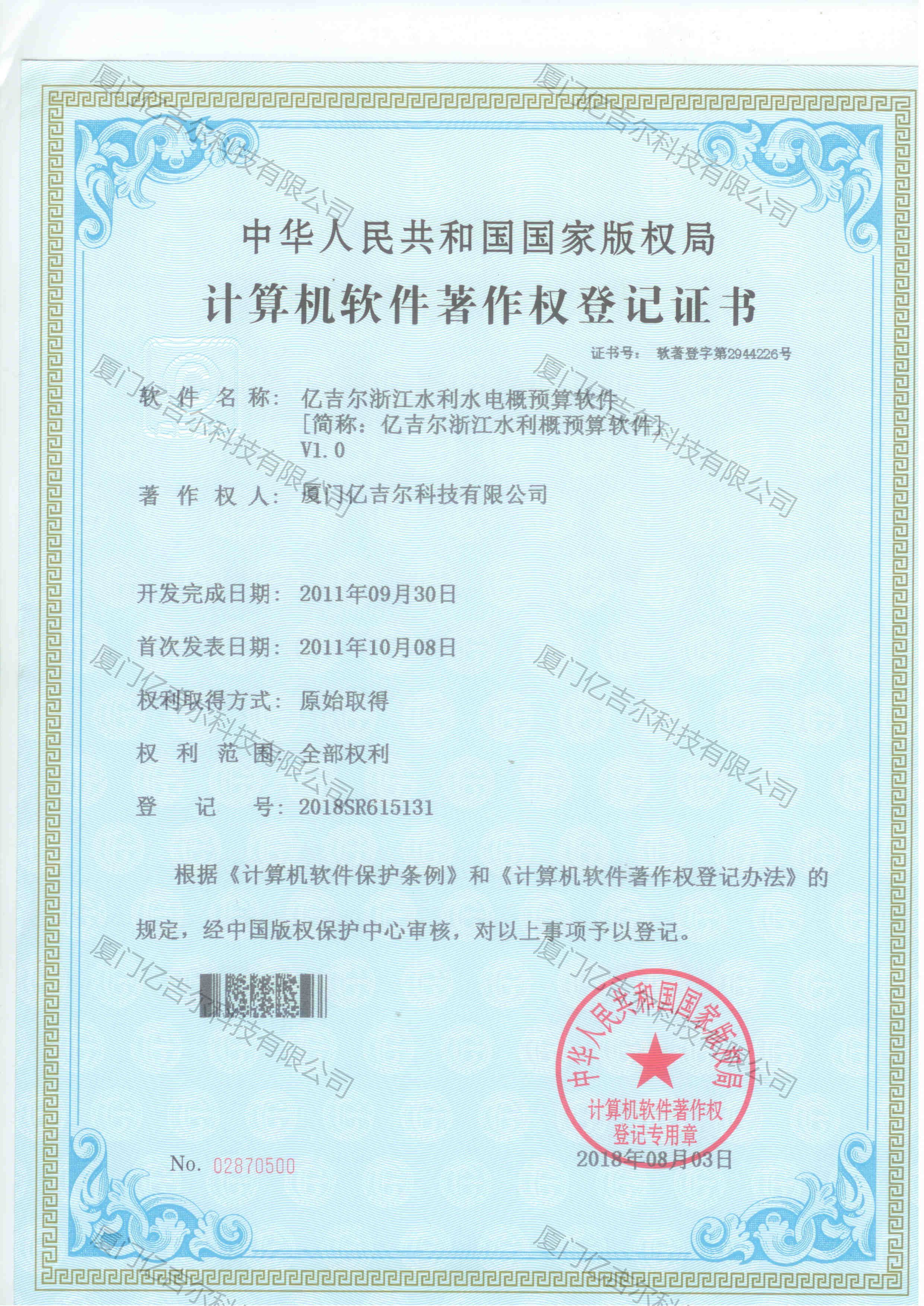 億吉爾浙江水利水電概預(yù)算軟件著作權(quán)登記證書(shū)
